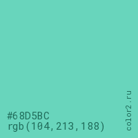 Цвет #68D5BC в цветовой модели RGB обозначается тремя октетами (104, 213, 188) в десятичном формате и #68D5BC в шестнадцатиричном (hex) формате, которые являются интенсивностью красного 104 (hex 68), интенсивность зелёного 213 (hex D5) и интенсивность синего 188 (hex BC).