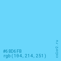 Цвет #68D6FB в цветовой модели RGB обозначается тремя октетами (104, 214, 251) в десятичном формате и #68D6FB в шестнадцатиричном (hex) формате, которые являются интенсивностью красного 104 (hex 68), интенсивность зелёного 214 (hex D6) и интенсивность синего 251 (hex FB).