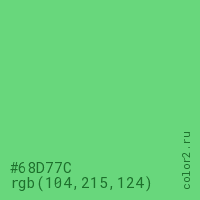 Цвет #68D77C в цветовой модели RGB обозначается тремя октетами (104, 215, 124) в десятичном формате и #68D77C в шестнадцатиричном (hex) формате, которые являются интенсивностью красного 104 (hex 68), интенсивность зелёного 215 (hex D7) и интенсивность синего 124 (hex 7C).