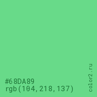 Цвет #68DA89 в цветовой модели RGB обозначается тремя октетами (104, 218, 137) в десятичном формате и #68DA89 в шестнадцатиричном (hex) формате, которые являются интенсивностью красного 104 (hex 68), интенсивность зелёного 218 (hex DA) и интенсивность синего 137 (hex 89).