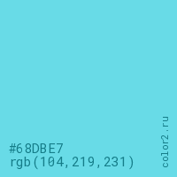 Цвет #68DBE7 в цветовой модели RGB обозначается тремя октетами (104, 219, 231) в десятичном формате и #68DBE7 в шестнадцатиричном (hex) формате, которые являются интенсивностью красного 104 (hex 68), интенсивность зелёного 219 (hex DB) и интенсивность синего 231 (hex E7).