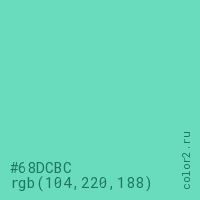 Цвет #68DCBC в цветовой модели RGB обозначается тремя октетами (104, 220, 188) в десятичном формате и #68DCBC в шестнадцатиричном (hex) формате, которые являются интенсивностью красного 104 (hex 68), интенсивность зелёного 220 (hex DC) и интенсивность синего 188 (hex BC).