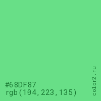 Цвет #68DF87 в цветовой модели RGB обозначается тремя октетами (104, 223, 135) в десятичном формате и #68DF87 в шестнадцатиричном (hex) формате, которые являются интенсивностью красного 104 (hex 68), интенсивность зелёного 223 (hex DF) и интенсивность синего 135 (hex 87).