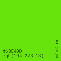Цвет #68E40D в цветовой модели RGB обозначается тремя октетами (104, 228, 13) в десятичном формате и #68E40D в шестнадцатиричном (hex) формате, которые являются интенсивностью красного 104 (hex 68), интенсивность зелёного 228 (hex E4) и интенсивность синего 13 (hex 0D).