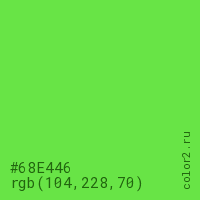 Цвет #68E446 в цветовой модели RGB обозначается тремя октетами (104, 228, 70) в десятичном формате и #68E446 в шестнадцатиричном (hex) формате, которые являются интенсивностью красного 104 (hex 68), интенсивность зелёного 228 (hex E4) и интенсивность синего 70 (hex 46).