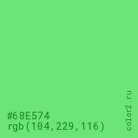Цвет #68E574 в цветовой модели RGB обозначается тремя октетами (104, 229, 116) в десятичном формате и #68E574 в шестнадцатиричном (hex) формате, которые являются интенсивностью красного 104 (hex 68), интенсивность зелёного 229 (hex E5) и интенсивность синего 116 (hex 74).