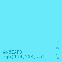 Цвет #68EAFB в цветовой модели RGB обозначается тремя октетами (104, 234, 251) в десятичном формате и #68EAFB в шестнадцатиричном (hex) формате, которые являются интенсивностью красного 104 (hex 68), интенсивность зелёного 234 (hex EA) и интенсивность синего 251 (hex FB).