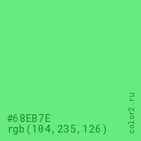 Цвет #68EB7E в цветовой модели RGB обозначается тремя октетами (104, 235, 126) в десятичном формате и #68EB7E в шестнадцатиричном (hex) формате, которые являются интенсивностью красного 104 (hex 68), интенсивность зелёного 235 (hex EB) и интенсивность синего 126 (hex 7E).