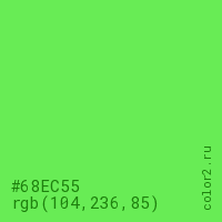 Цвет #68EC55 в цветовой модели RGB обозначается тремя октетами (104, 236, 85) в десятичном формате и #68EC55 в шестнадцатиричном (hex) формате, которые являются интенсивностью красного 104 (hex 68), интенсивность зелёного 236 (hex EC) и интенсивность синего 85 (hex 55).