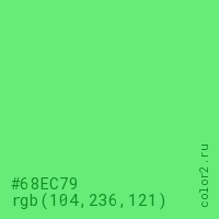 Цвет #68EC79 в цветовой модели RGB обозначается тремя октетами (104, 236, 121) в десятичном формате и #68EC79 в шестнадцатиричном (hex) формате, которые являются интенсивностью красного 104 (hex 68), интенсивность зелёного 236 (hex EC) и интенсивность синего 121 (hex 79).