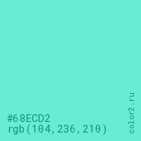 Цвет #68ECD2 в цветовой модели RGB обозначается тремя октетами (104, 236, 210) в десятичном формате и #68ECD2 в шестнадцатиричном (hex) формате, которые являются интенсивностью красного 104 (hex 68), интенсивность зелёного 236 (hex EC) и интенсивность синего 210 (hex D2).