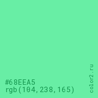 Цвет #68EEA5 в цветовой модели RGB обозначается тремя октетами (104, 238, 165) в десятичном формате и #68EEA5 в шестнадцатиричном (hex) формате, которые являются интенсивностью красного 104 (hex 68), интенсивность зелёного 238 (hex EE) и интенсивность синего 165 (hex A5).