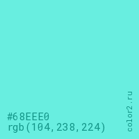 Цвет #68EEE0 в цветовой модели RGB обозначается тремя октетами (104, 238, 224) в десятичном формате и #68EEE0 в шестнадцатиричном (hex) формате, которые являются интенсивностью красного 104 (hex 68), интенсивность зелёного 238 (hex EE) и интенсивность синего 224 (hex E0).