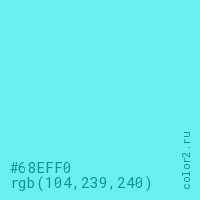 Цвет #68EFF0 в цветовой модели RGB обозначается тремя октетами (104, 239, 240) в десятичном формате и #68EFF0 в шестнадцатиричном (hex) формате, которые являются интенсивностью красного 104 (hex 68), интенсивность зелёного 239 (hex EF) и интенсивность синего 240 (hex F0).