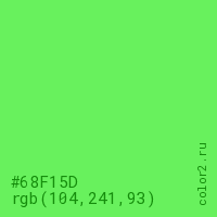 Цвет #68F15D в цветовой модели RGB обозначается тремя октетами (104, 241, 93) в десятичном формате и #68F15D в шестнадцатиричном (hex) формате, которые являются интенсивностью красного 104 (hex 68), интенсивность зелёного 241 (hex F1) и интенсивность синего 93 (hex 5D).