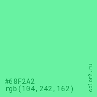 Цвет #68F2A2 в цветовой модели RGB обозначается тремя октетами (104, 242, 162) в десятичном формате и #68F2A2 в шестнадцатиричном (hex) формате, которые являются интенсивностью красного 104 (hex 68), интенсивность зелёного 242 (hex F2) и интенсивность синего 162 (hex A2).