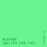 Цвет #68F48F в цветовой модели RGB обозначается тремя октетами (104, 244, 143) в десятичном формате и #68F48F в шестнадцатиричном (hex) формате, которые являются интенсивностью красного 104 (hex 68), интенсивность зелёного 244 (hex F4) и интенсивность синего 143 (hex 8F).