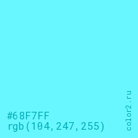 Цвет #68F7FF в цветовой модели RGB обозначается тремя октетами (104, 247, 255) в десятичном формате и #68F7FF в шестнадцатиричном (hex) формате, которые являются интенсивностью красного 104 (hex 68), интенсивность зелёного 247 (hex F7) и интенсивность синего 255 (hex FF).