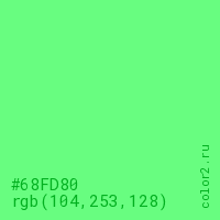 Цвет #68FD80 в цветовой модели RGB обозначается тремя октетами (104, 253, 128) в десятичном формате и #68FD80 в шестнадцатиричном (hex) формате, которые являются интенсивностью красного 104 (hex 68), интенсивность зелёного 253 (hex FD) и интенсивность синего 128 (hex 80).