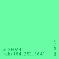 Цвет #68FDA4 в цветовой модели RGB обозначается тремя октетами (104, 253, 164) в десятичном формате и #68FDA4 в шестнадцатиричном (hex) формате, которые являются интенсивностью красного 104 (hex 68), интенсивность зелёного 253 (hex FD) и интенсивность синего 164 (hex A4).