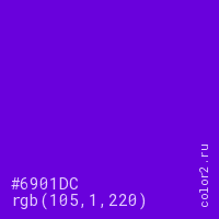 Цвет #6901DC в цветовой модели RGB обозначается тремя октетами (105, 1, 220) в десятичном формате и #6901DC в шестнадцатиричном (hex) формате, которые являются интенсивностью красного 105 (hex 69), интенсивность зелёного 1 (hex 01) и интенсивность синего 220 (hex DC).
