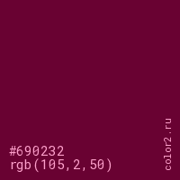 Цвет #690232 в цветовой модели RGB обозначается тремя октетами (105, 2, 50) в десятичном формате и #690232 в шестнадцатиричном (hex) формате, которые являются интенсивностью красного 105 (hex 69), интенсивность зелёного 2 (hex 02) и интенсивность синего 50 (hex 32).