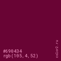 Цвет #690434 в цветовой модели RGB обозначается тремя октетами (105, 4, 52) в десятичном формате и #690434 в шестнадцатиричном (hex) формате, которые являются интенсивностью красного 105 (hex 69), интенсивность зелёного 4 (hex 04) и интенсивность синего 52 (hex 34).
