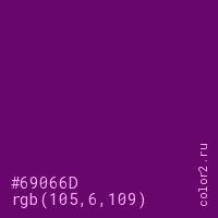 Цвет #69066D в цветовой модели RGB обозначается тремя октетами (105, 6, 109) в десятичном формате и #69066D в шестнадцатиричном (hex) формате, которые являются интенсивностью красного 105 (hex 69), интенсивность зелёного 6 (hex 06) и интенсивность синего 109 (hex 6D).