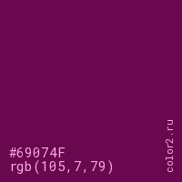 Цвет #69074F в цветовой модели RGB обозначается тремя октетами (105, 7, 79) в десятичном формате и #69074F в шестнадцатиричном (hex) формате, которые являются интенсивностью красного 105 (hex 69), интенсивность зелёного 7 (hex 07) и интенсивность синего 79 (hex 4F).