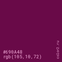 Цвет #690A48 в цветовой модели RGB обозначается тремя октетами (105, 10, 72) в десятичном формате и #690A48 в шестнадцатиричном (hex) формате, которые являются интенсивностью красного 105 (hex 69), интенсивность зелёного 10 (hex 0A) и интенсивность синего 72 (hex 48).