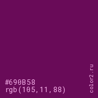 Цвет #690B58 в цветовой модели RGB обозначается тремя октетами (105, 11, 88) в десятичном формате и #690B58 в шестнадцатиричном (hex) формате, которые являются интенсивностью красного 105 (hex 69), интенсивность зелёного 11 (hex 0B) и интенсивность синего 88 (hex 58).