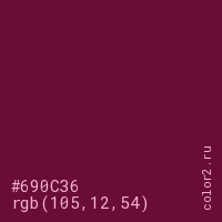 Цвет #690C36 в цветовой модели RGB обозначается тремя октетами (105, 12, 54) в десятичном формате и #690C36 в шестнадцатиричном (hex) формате, которые являются интенсивностью красного 105 (hex 69), интенсивность зелёного 12 (hex 0C) и интенсивность синего 54 (hex 36).