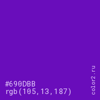 Цвет #690DBB в цветовой модели RGB обозначается тремя октетами (105, 13, 187) в десятичном формате и #690DBB в шестнадцатиричном (hex) формате, которые являются интенсивностью красного 105 (hex 69), интенсивность зелёного 13 (hex 0D) и интенсивность синего 187 (hex BB).