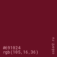 Цвет #691024 в цветовой модели RGB обозначается тремя октетами (105, 16, 36) в десятичном формате и #691024 в шестнадцатиричном (hex) формате, которые являются интенсивностью красного 105 (hex 69), интенсивность зелёного 16 (hex 10) и интенсивность синего 36 (hex 24).