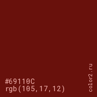 Цвет #69110C в цветовой модели RGB обозначается тремя октетами (105, 17, 12) в десятичном формате и #69110C в шестнадцатиричном (hex) формате, которые являются интенсивностью красного 105 (hex 69), интенсивность зелёного 17 (hex 11) и интенсивность синего 12 (hex 0C).