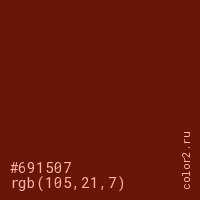 Цвет #691507 в цветовой модели RGB обозначается тремя октетами (105, 21, 7) в десятичном формате и #691507 в шестнадцатиричном (hex) формате, которые являются интенсивностью красного 105 (hex 69), интенсивность зелёного 21 (hex 15) и интенсивность синего 7 (hex 07).