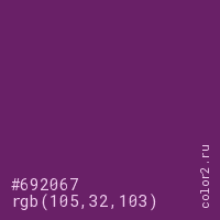 Цвет #692067 в цветовой модели RGB обозначается тремя октетами (105, 32, 103) в десятичном формате и #692067 в шестнадцатиричном (hex) формате, которые являются интенсивностью красного 105 (hex 69), интенсивность зелёного 32 (hex 20) и интенсивность синего 103 (hex 67).