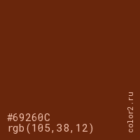 Цвет #69260C в цветовой модели RGB обозначается тремя октетами (105, 38, 12) в десятичном формате и #69260C в шестнадцатиричном (hex) формате, которые являются интенсивностью красного 105 (hex 69), интенсивность зелёного 38 (hex 26) и интенсивность синего 12 (hex 0C).