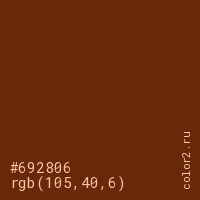 Цвет #692806 в цветовой модели RGB обозначается тремя октетами (105, 40, 6) в десятичном формате и #692806 в шестнадцатиричном (hex) формате, которые являются интенсивностью красного 105 (hex 69), интенсивность зелёного 40 (hex 28) и интенсивность синего 6 (hex 06).