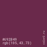 Цвет #692B49 в цветовой модели RGB обозначается тремя октетами (105, 43, 73) в десятичном формате и #692B49 в шестнадцатиричном (hex) формате, которые являются интенсивностью красного 105 (hex 69), интенсивность зелёного 43 (hex 2B) и интенсивность синего 73 (hex 49).