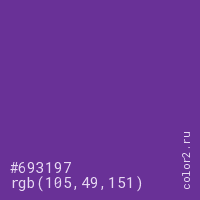 Цвет #693197 в цветовой модели RGB обозначается тремя октетами (105, 49, 151) в десятичном формате и #693197 в шестнадцатиричном (hex) формате, которые являются интенсивностью красного 105 (hex 69), интенсивность зелёного 49 (hex 31) и интенсивность синего 151 (hex 97).