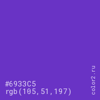Цвет #6933C5 в цветовой модели RGB обозначается тремя октетами (105, 51, 197) в десятичном формате и #6933C5 в шестнадцатиричном (hex) формате, которые являются интенсивностью красного 105 (hex 69), интенсивность зелёного 51 (hex 33) и интенсивность синего 197 (hex C5).