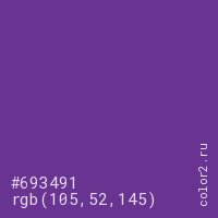 Цвет #693491 в цветовой модели RGB обозначается тремя октетами (105, 52, 145) в десятичном формате и #693491 в шестнадцатиричном (hex) формате, которые являются интенсивностью красного 105 (hex 69), интенсивность зелёного 52 (hex 34) и интенсивность синего 145 (hex 91).