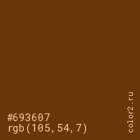 Цвет #693607 в цветовой модели RGB обозначается тремя октетами (105, 54, 7) в десятичном формате и #693607 в шестнадцатиричном (hex) формате, которые являются интенсивностью красного 105 (hex 69), интенсивность зелёного 54 (hex 36) и интенсивность синего 7 (hex 07).