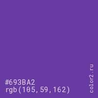 Цвет #693BA2 в цветовой модели RGB обозначается тремя октетами (105, 59, 162) в десятичном формате и #693BA2 в шестнадцатиричном (hex) формате, которые являются интенсивностью красного 105 (hex 69), интенсивность зелёного 59 (hex 3B) и интенсивность синего 162 (hex A2).