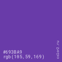 Цвет #693BA9 в цветовой модели RGB обозначается тремя октетами (105, 59, 169) в десятичном формате и #693BA9 в шестнадцатиричном (hex) формате, которые являются интенсивностью красного 105 (hex 69), интенсивность зелёного 59 (hex 3B) и интенсивность синего 169 (hex A9).
