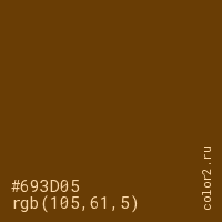 Цвет #693D05 в цветовой модели RGB обозначается тремя октетами (105, 61, 5) в десятичном формате и #693D05 в шестнадцатиричном (hex) формате, которые являются интенсивностью красного 105 (hex 69), интенсивность зелёного 61 (hex 3D) и интенсивность синего 5 (hex 05).