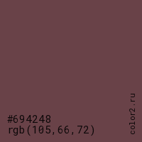 Цвет #694248 в цветовой модели RGB обозначается тремя октетами (105, 66, 72) в десятичном формате и #694248 в шестнадцатиричном (hex) формате, которые являются интенсивностью красного 105 (hex 69), интенсивность зелёного 66 (hex 42) и интенсивность синего 72 (hex 48).