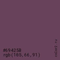 Цвет #69425B в цветовой модели RGB обозначается тремя октетами (105, 66, 91) в десятичном формате и #69425B в шестнадцатиричном (hex) формате, которые являются интенсивностью красного 105 (hex 69), интенсивность зелёного 66 (hex 42) и интенсивность синего 91 (hex 5B).