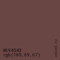 Цвет #694543 в цветовой модели RGB обозначается тремя октетами (105, 69, 67) в десятичном формате и #694543 в шестнадцатиричном (hex) формате, которые являются интенсивностью красного 105 (hex 69), интенсивность зелёного 69 (hex 45) и интенсивность синего 67 (hex 43).